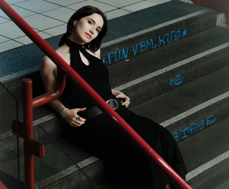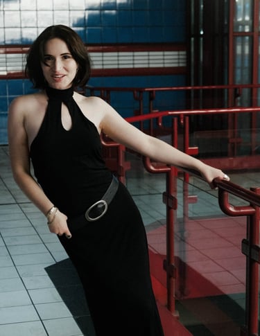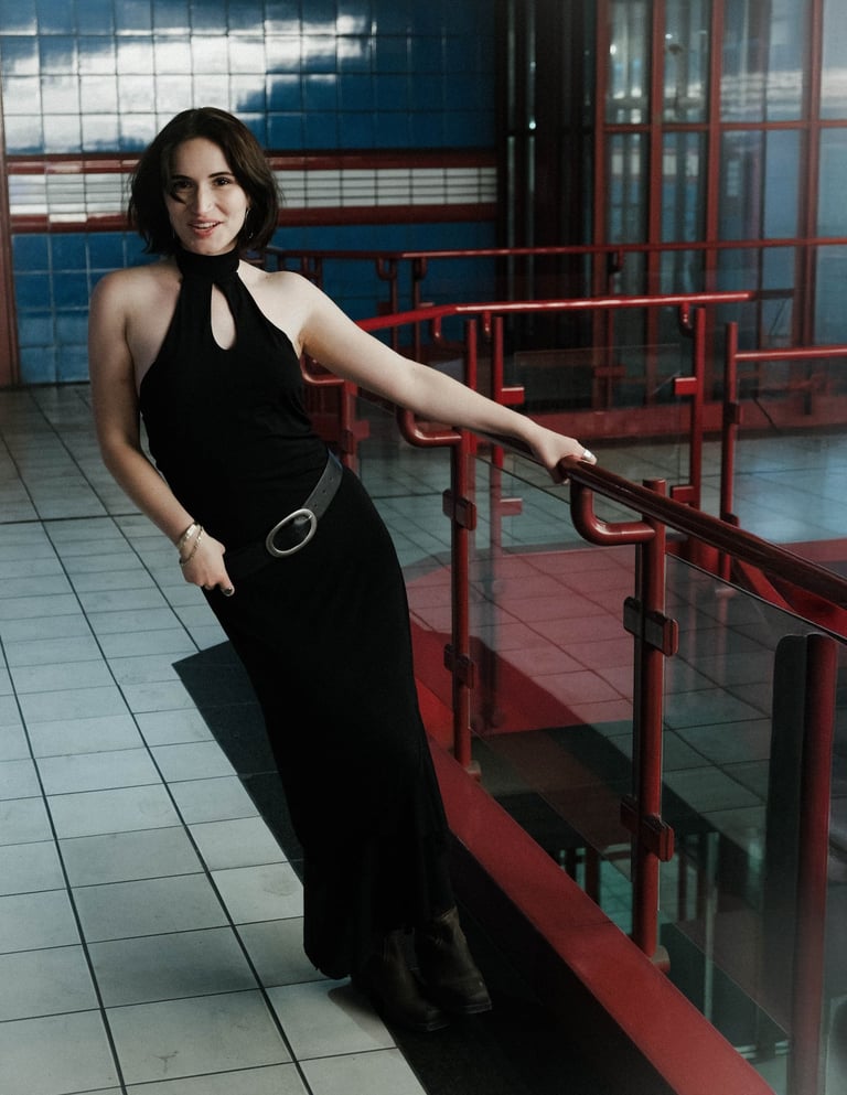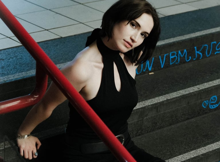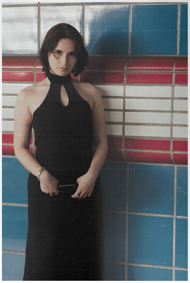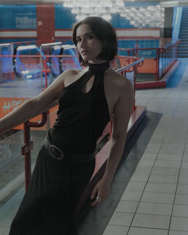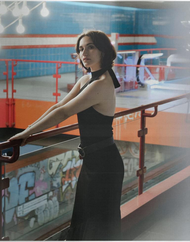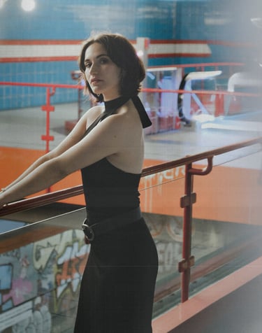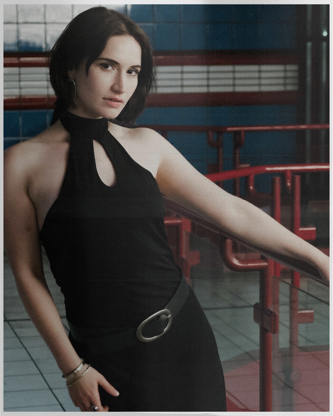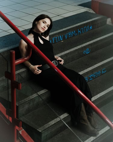 Metro Muse merges bold femininity with industrial edge. Shot in a tiled, retro-futuristic setting, the series contrasts the model’s sleek black dress and sharp accessories with the graphic architecture of red rails and blue walls.