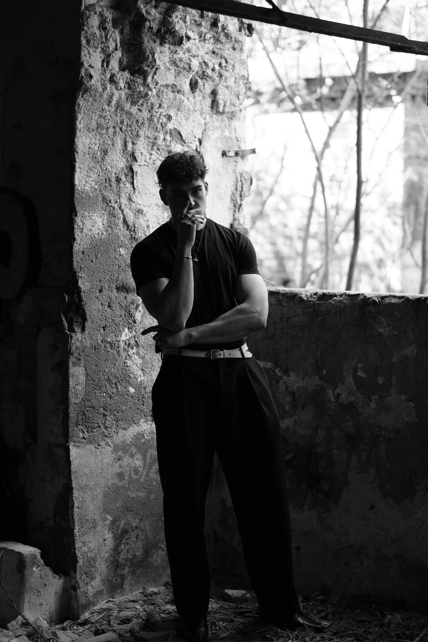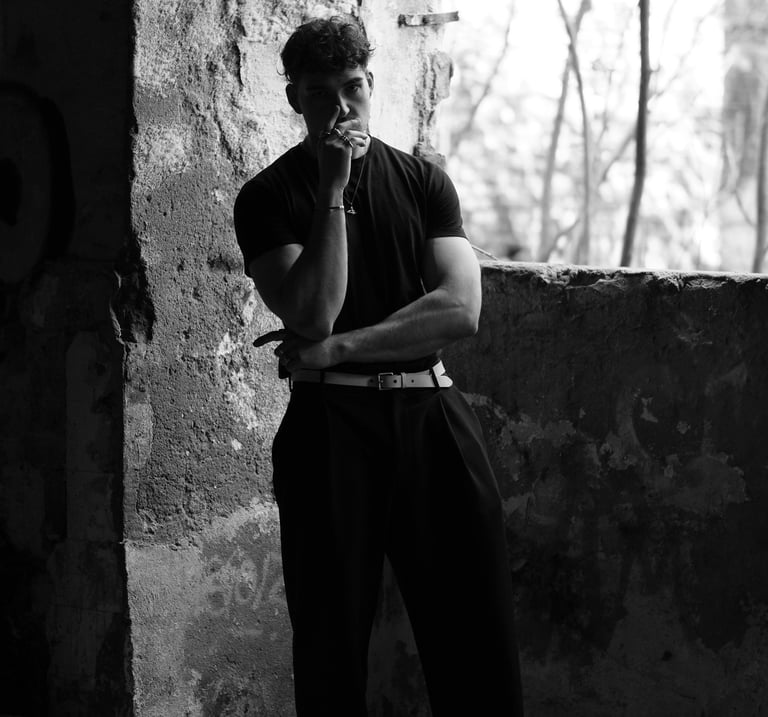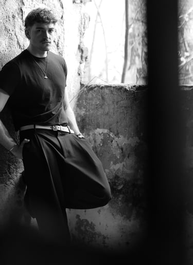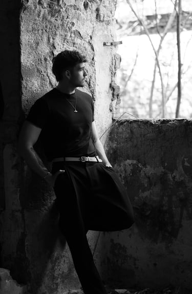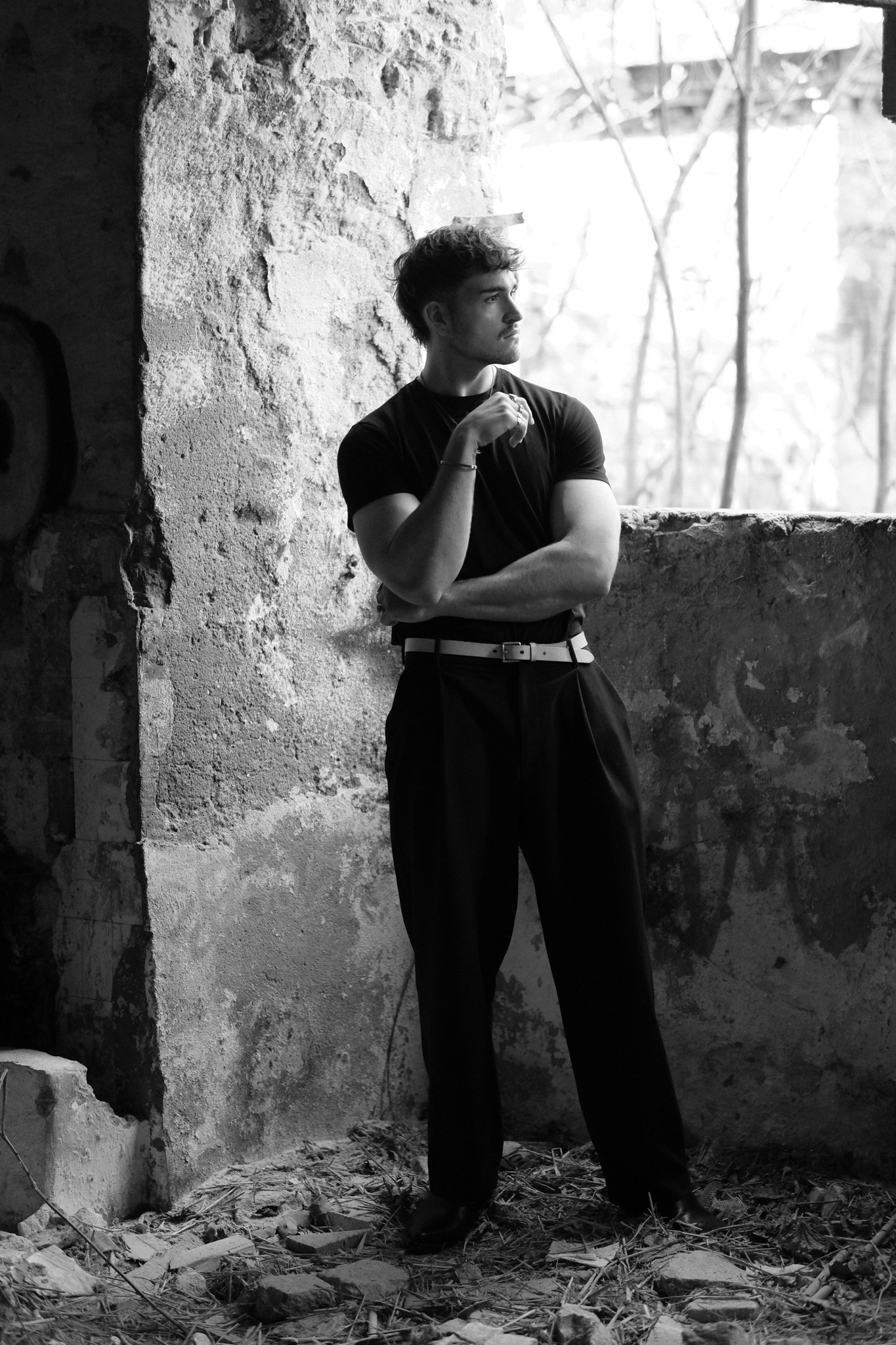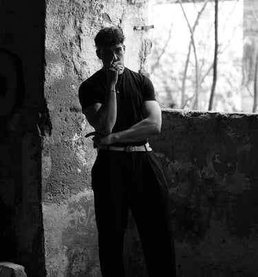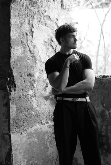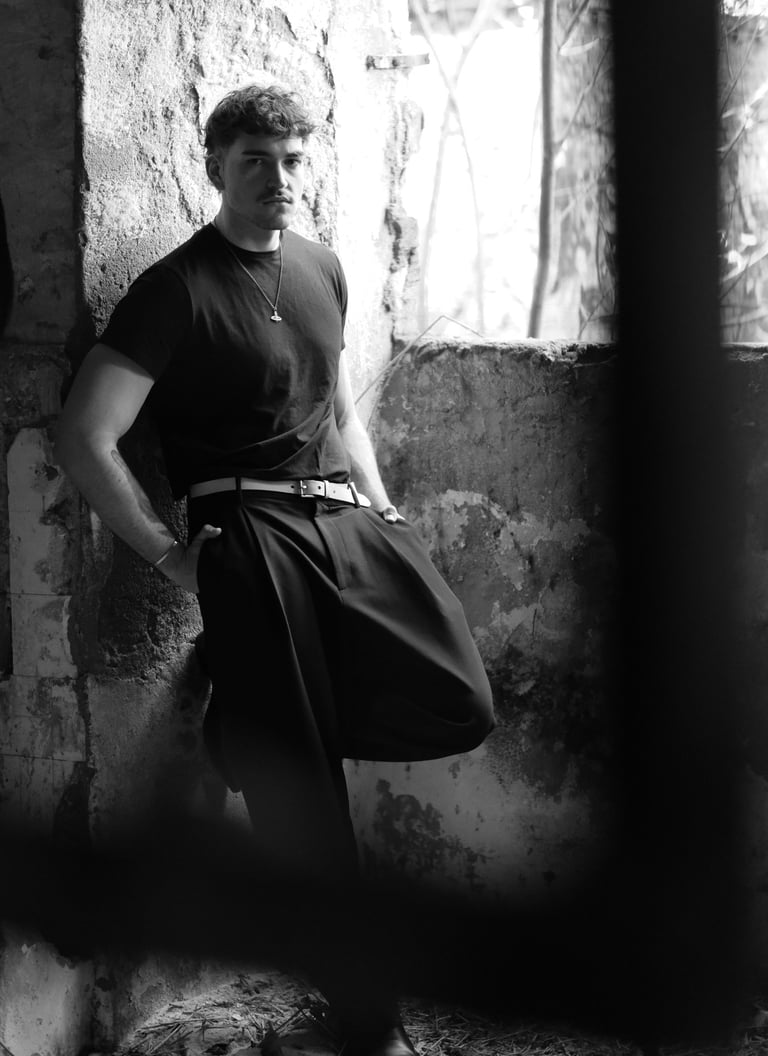 Sharp light cuts through decay, highlighting tension in posture and stillness in expression. With timeless styling and sculptural framing, the images blend vulnerability and control — masculinity not as performance, but as presence.