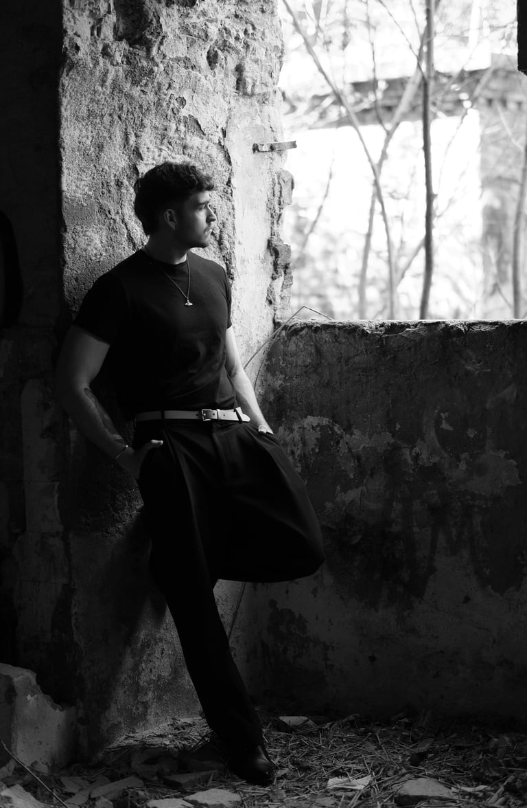 Set in a crumbling, textured space, this black-and-white series captures a man caught in quiet reflection.
