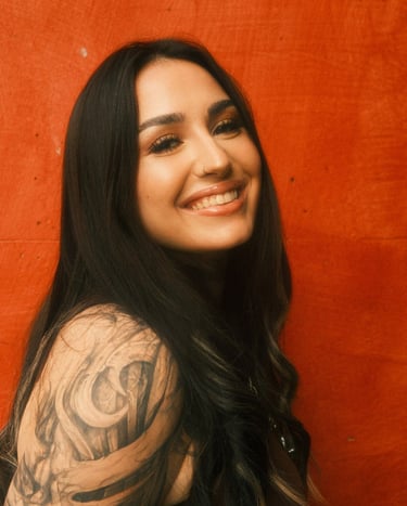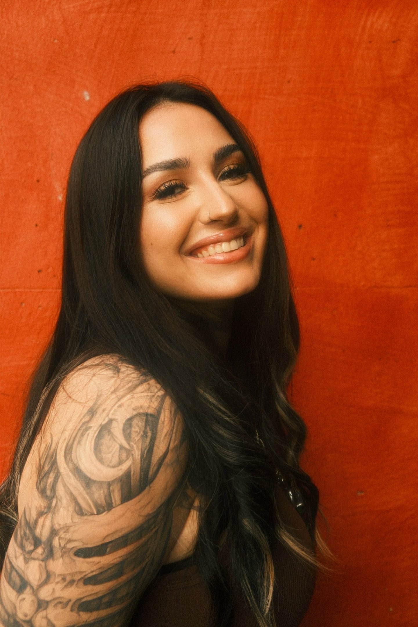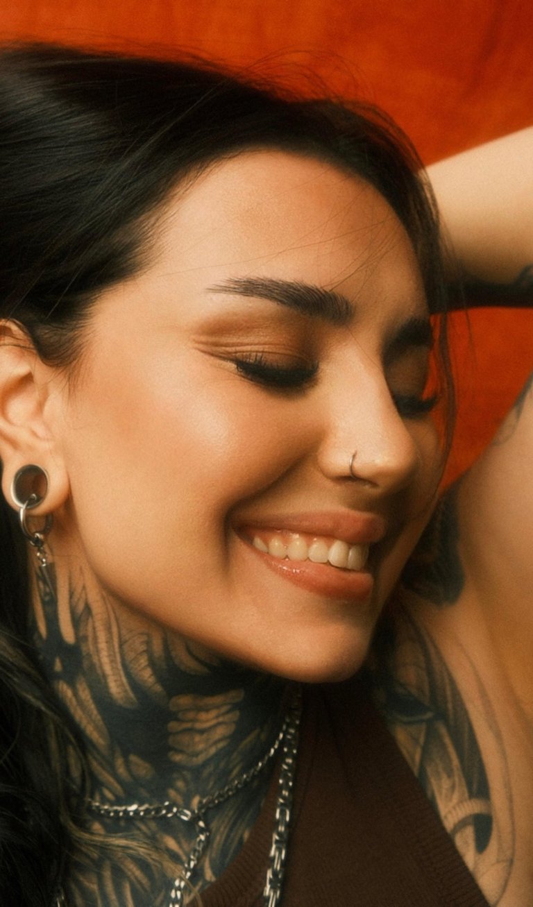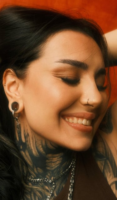 In this bold and intimate portrait series, soft lighting contrasts with the powerful presence of a tattooed woman against a vivid orange backdrop. Her expressions shift from introspective to radiant joy, reflecting strength, resilience, and vulnerability.