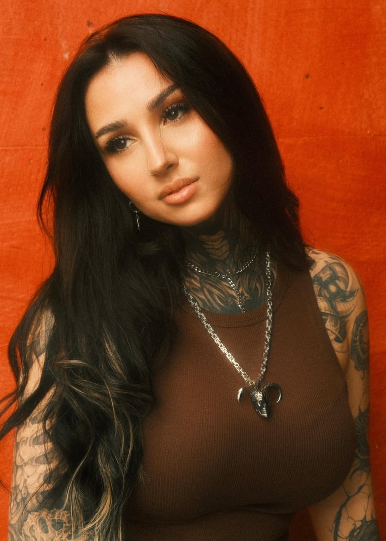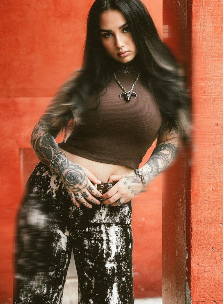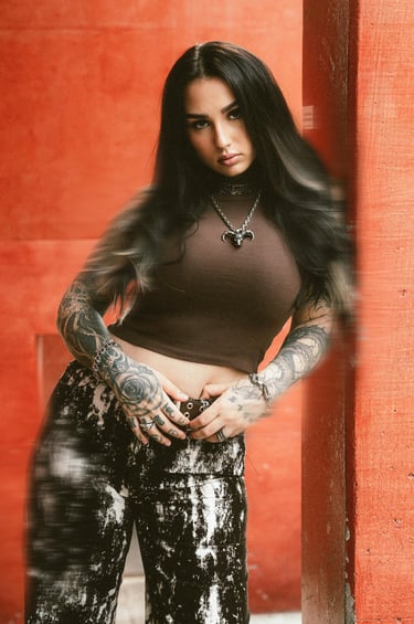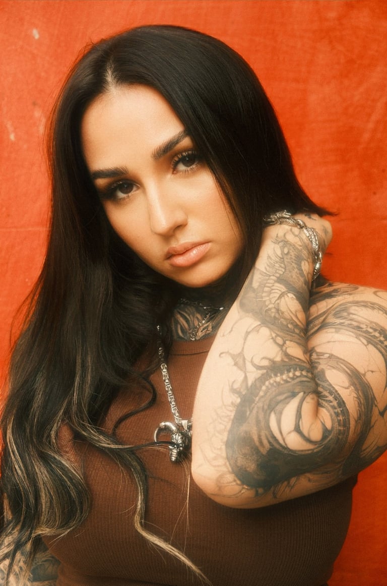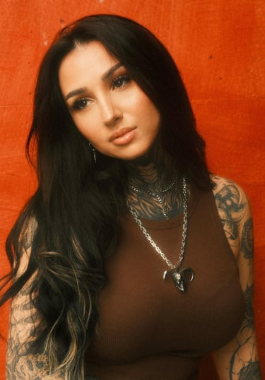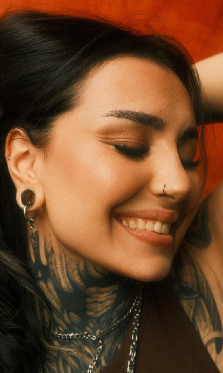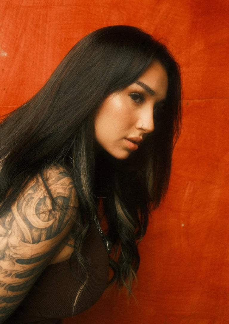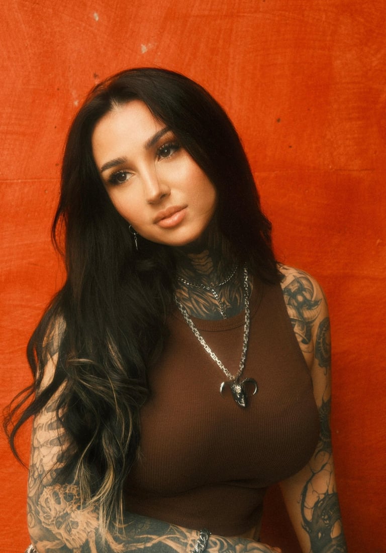 The visual language merges elegance with raw edge — celebrating individuality, feminine power, and self-expression. The warm, saturated tones enhance the intensity of her gaze and the intricate detail of her tattoos, crafting a story that is both fierce and deeply human.