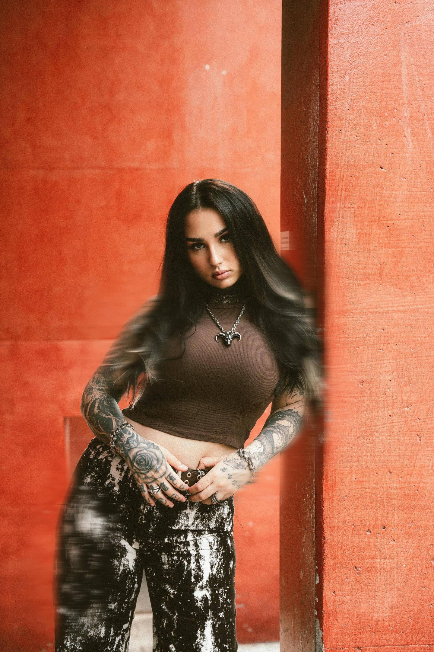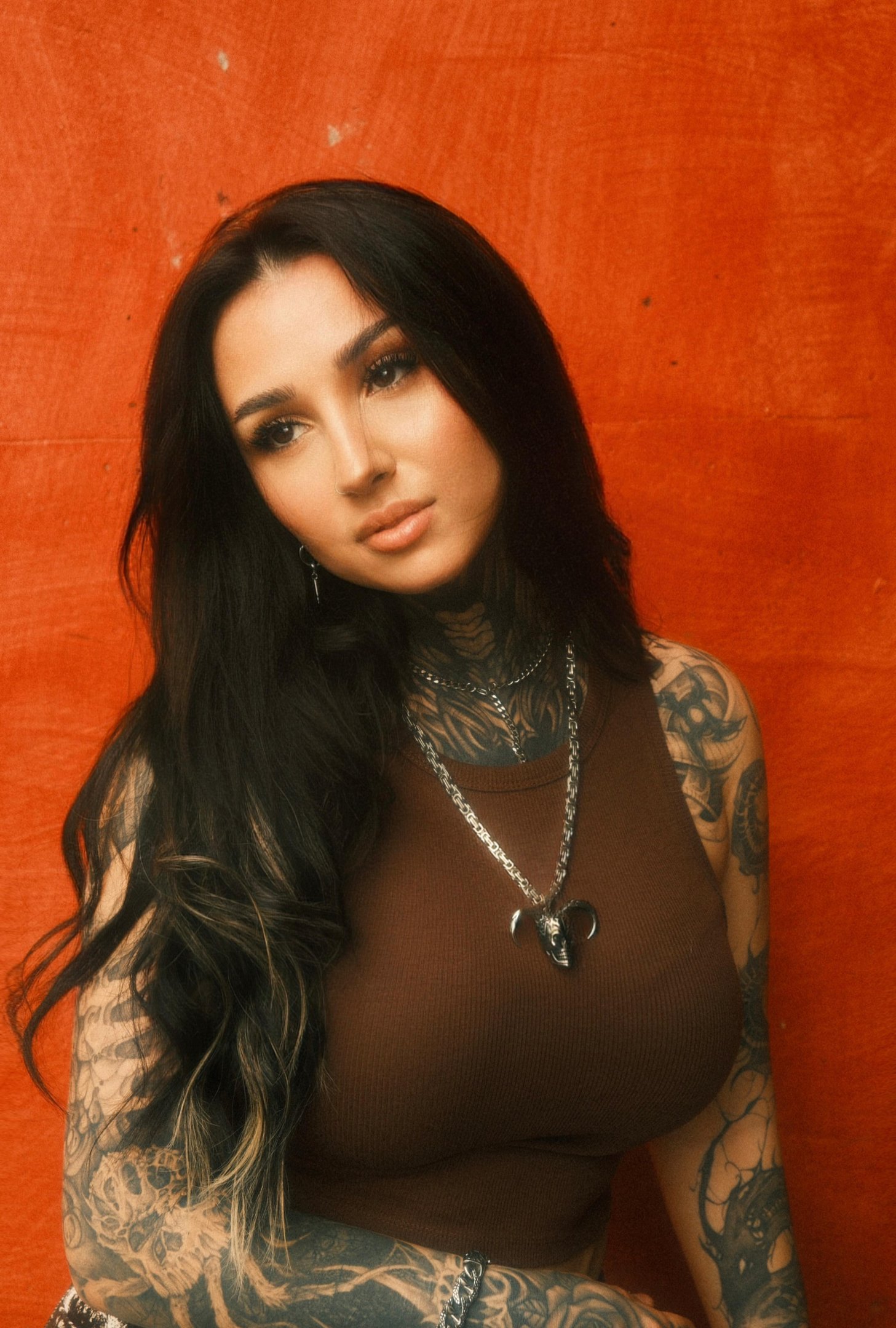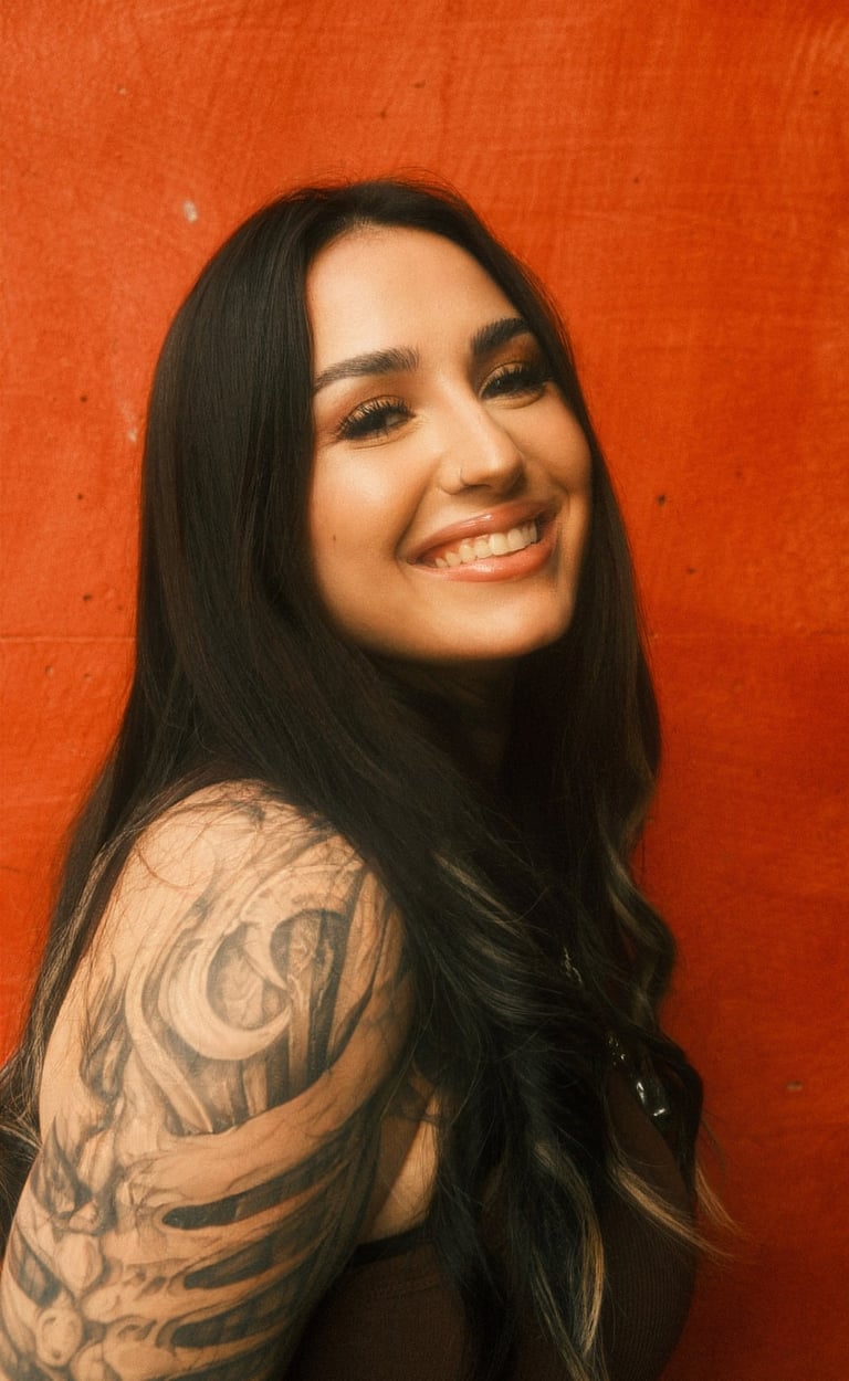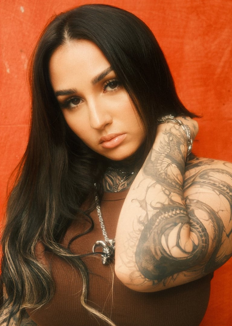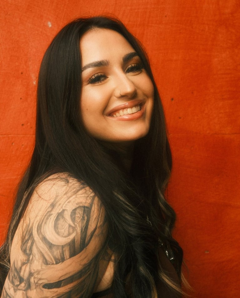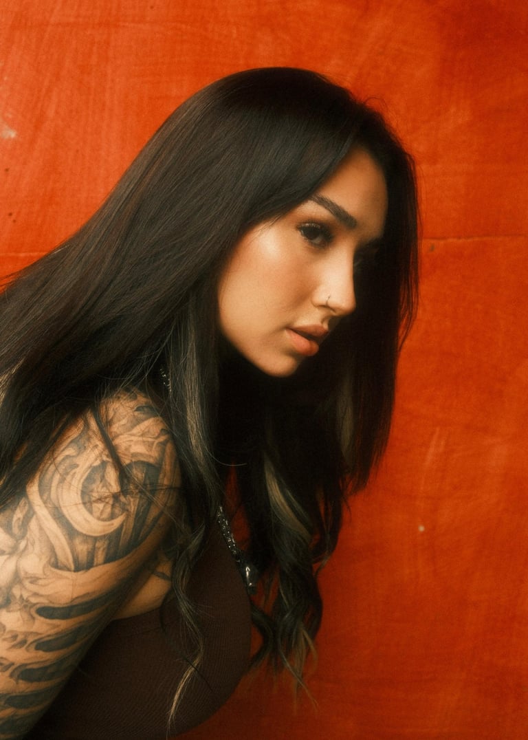 The visual language merges elegance with raw edge — celebrating individuality, feminine power, and self-expression. The warm, saturated tones enhance the intensity of her gaze and the intricate detail of her tattoos, crafting a story that is both fierce and deeply human.